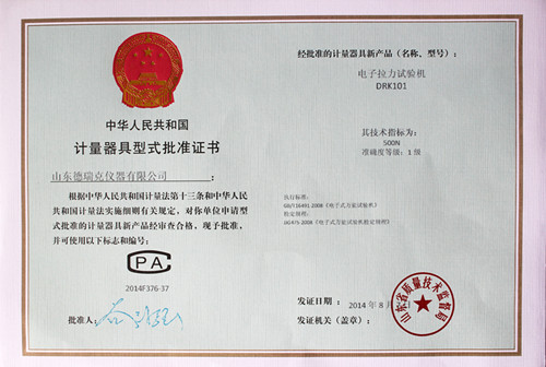 近日,德瑞克接到市局通知,在濟南市質量技術監督局一樓計量器具型式許可證窗口領取到了電子拉力試驗機型式批準證書(證書編號2014F376-37),加上之前領取的電子式抗壓試驗機(證書編號2014F277-37)、電子式壓縮試驗儀(證書編號2014F278-37)的型式批準證書,至此,德瑞克涉及的國家法定監管的計量產品已全部獲得證書。